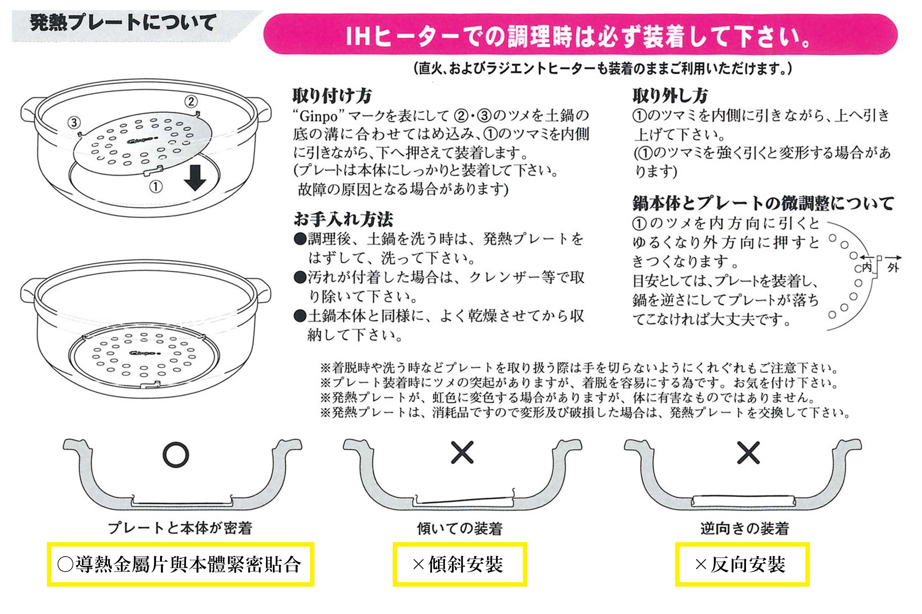 *烹飪後洗砂鍋時,請摘下導熱金屬片清洗。