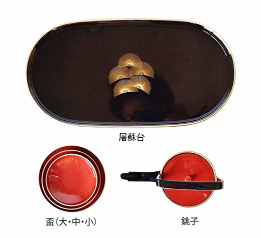 屠蘇酒通常會使用名叫屠蘇器(とそき)的酒器來盛裝,酒杯為一式三個,分別為大中小三種尺寸,一邊說「一人喝了全家都不會生病,一家喝了都不會生病。」一邊跟御節料理一起配著吃。