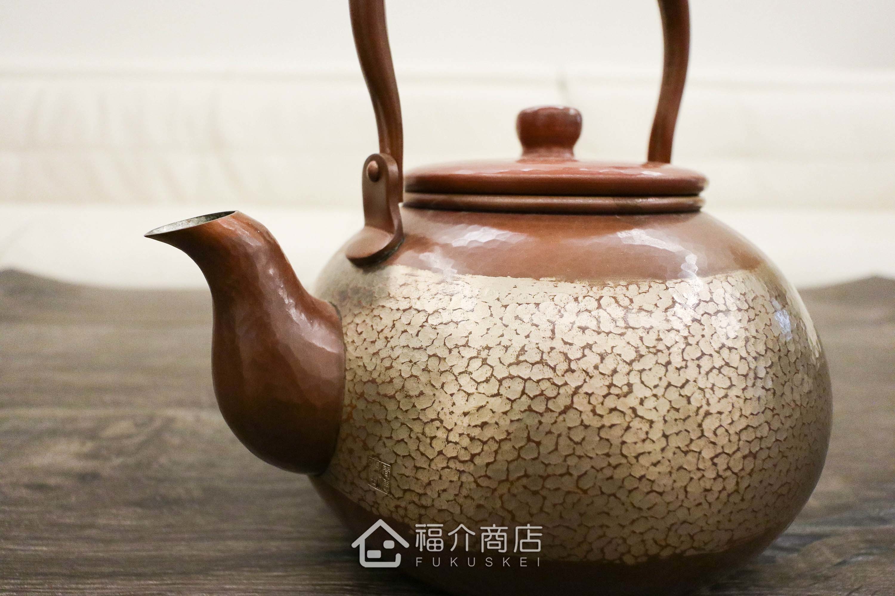 以手工敲上厚金箔,金色腰帶與紅銅色壺身形成強烈對比,金箔紋路細緻,壺身線條圓潤飽滿,值得品鑒與收藏。