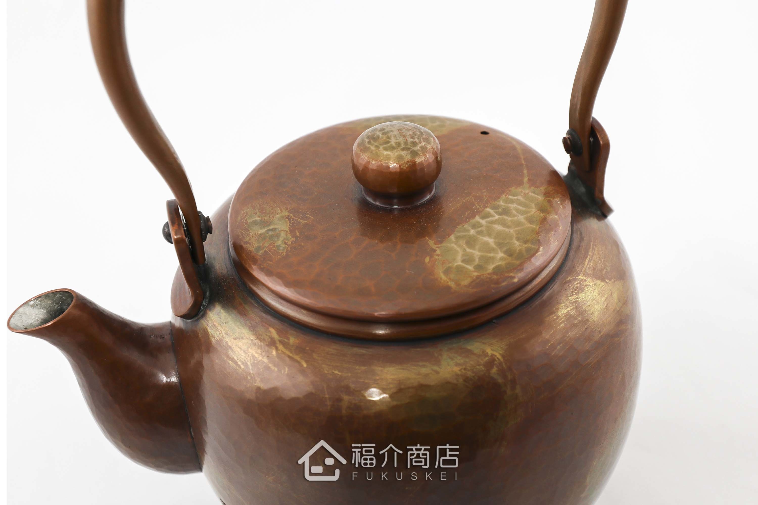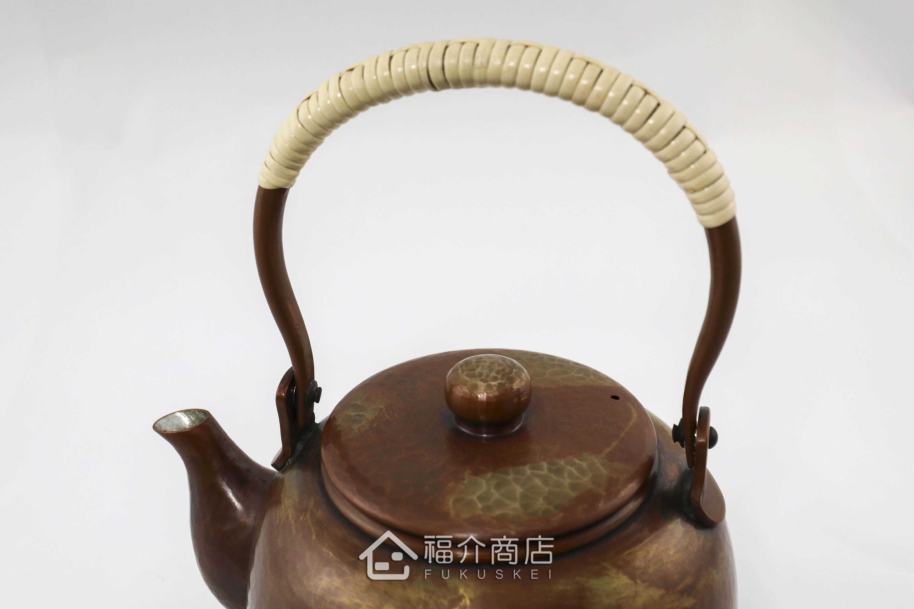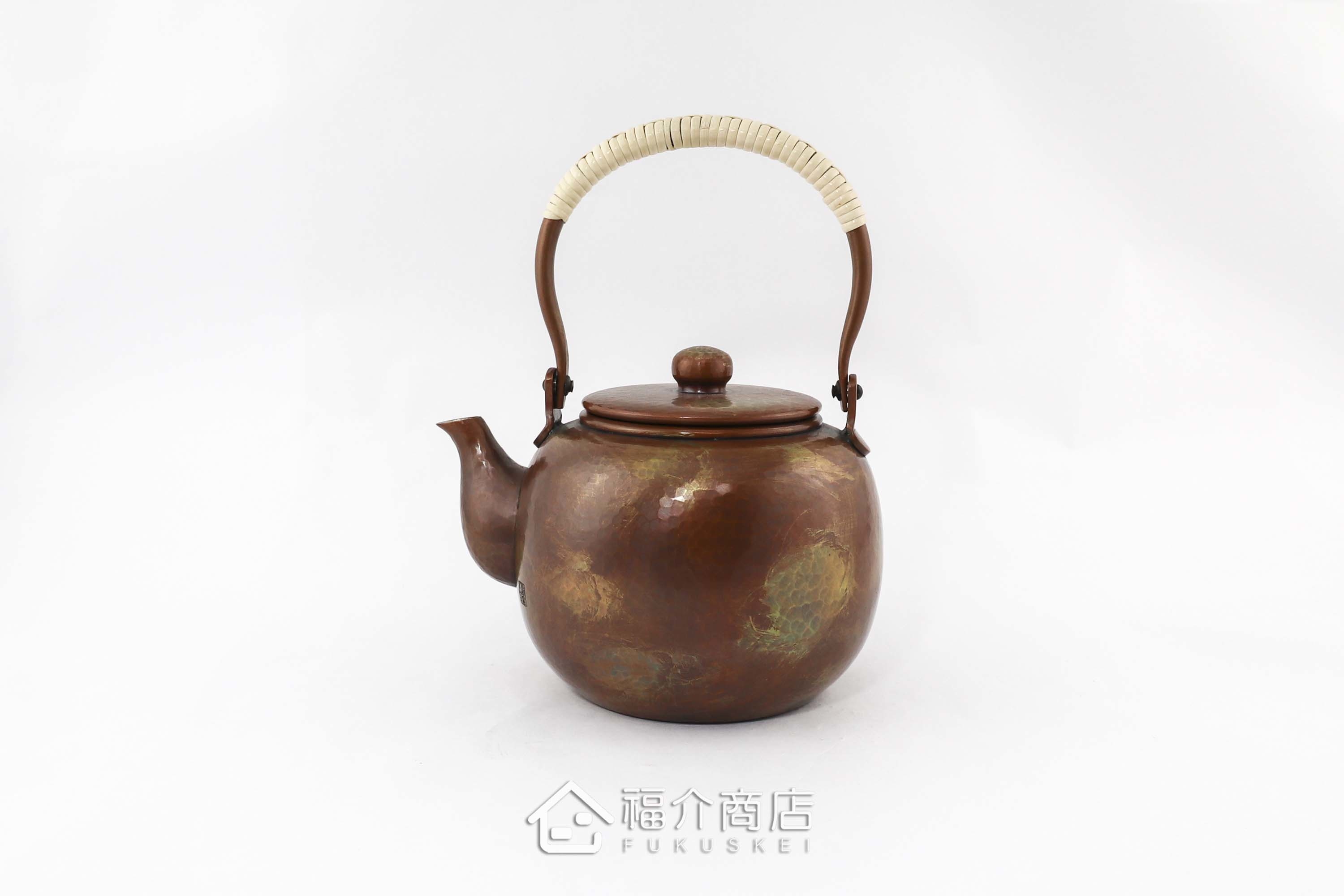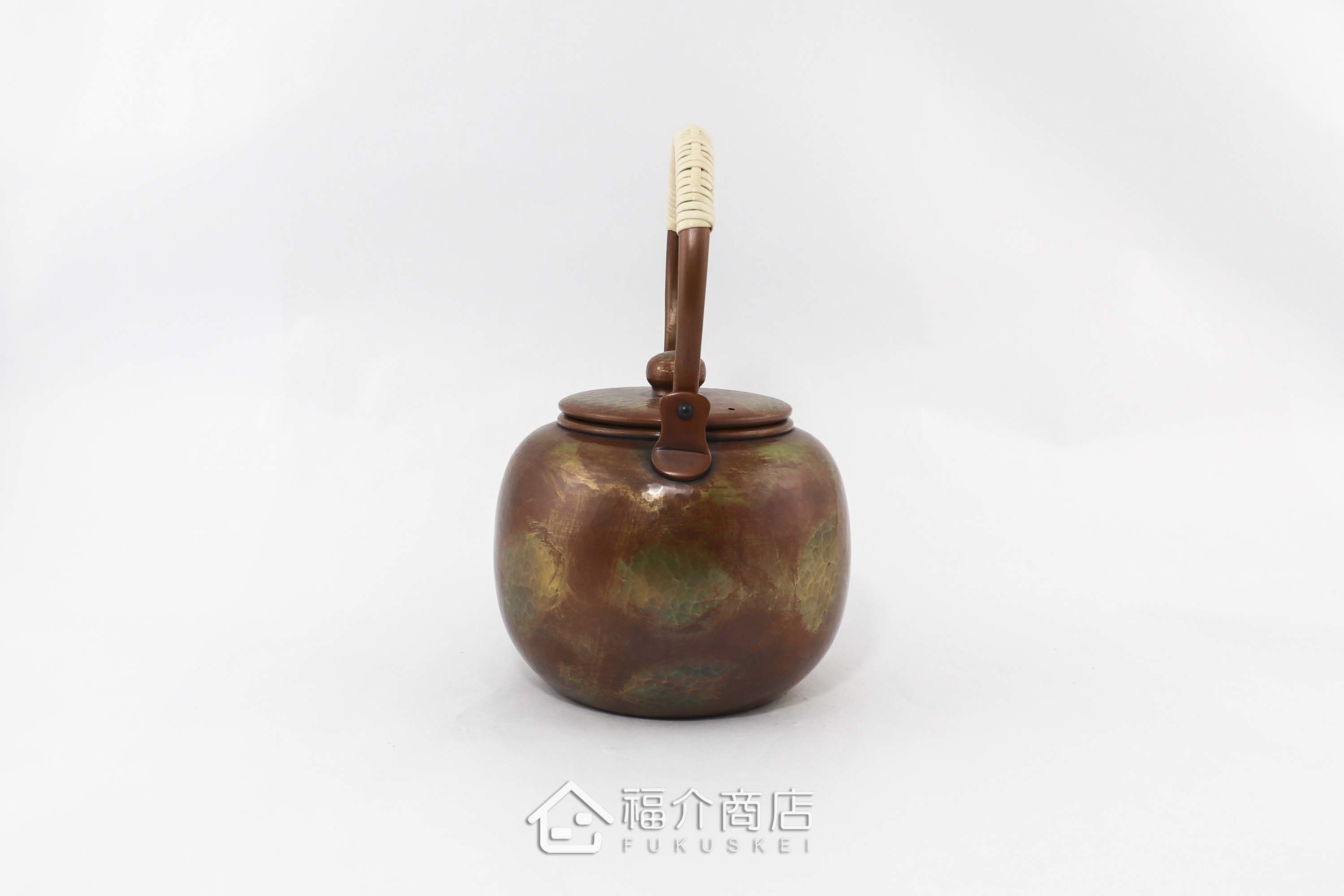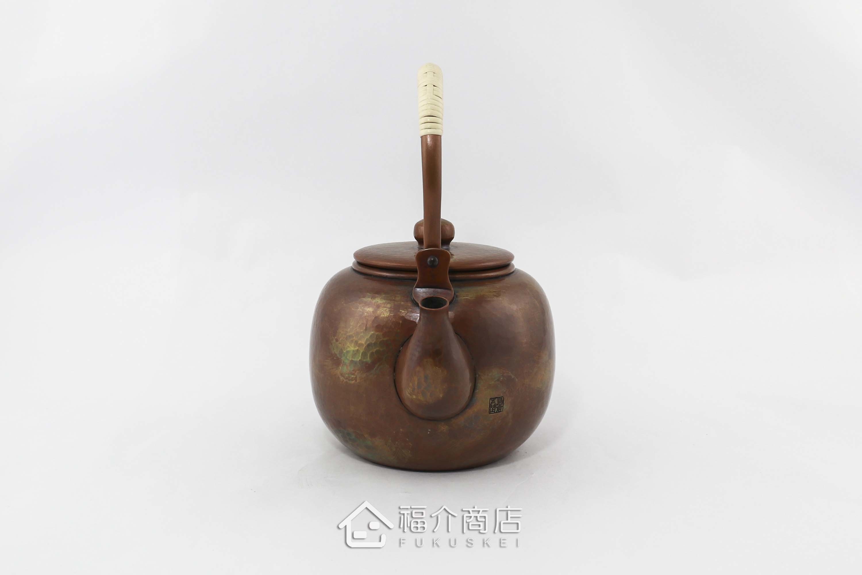 槌起銅器使用一片銅以手工槌打成型,包含壺蓋及蓋紐須依靠工匠多年的技巧敲打出高難度的圓潤線條。壺身使用古法酸化作色,散發古銅金色,不同角度光線折射出不同的光澤感,搭配包籐手把,數量稀少值得收藏。